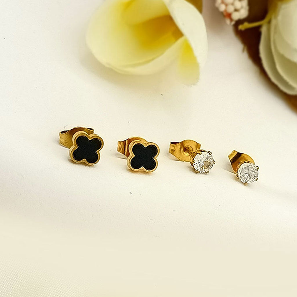 Upgrade your everyday jewelry collection with this Elegant Dual-Stud Earring Set, featuring two timeless designs. The first pair showcases a black enamel four-leaf clover set in a sleek gold frame — perfect for adding a classy, modern touch to your look. The second pair features brilliant cubic zirconia studs, offering a sparkling finish ideal for both daily wear and special occasions. Crafted from high-quality stainless steel, these earrings are anti-tarnish, hypoallergenic, and designed for lasting shine and comfort. A versatile set that blends charm and sophistication effortlessly.