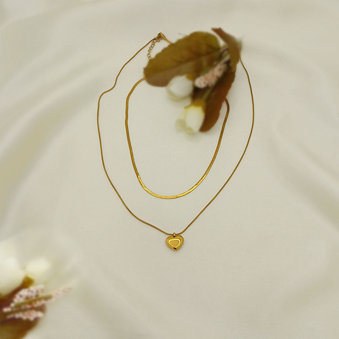 This layered necklace combines smooth elegance with a touch of sentiment. The top layer features a sleek flat snake chain, while the bottom layer holds a polished puffy heart pendant that adds a gentle, graceful shine. Designed in a rich gold-tone finish, it sits beautifully on the neckline and pairs effortlessly with both casual and chic outfits.